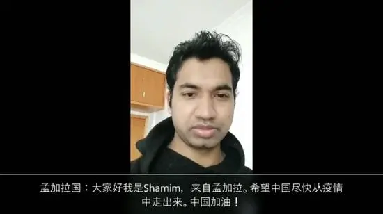 “我們錄制這個(gè)視頻主要是想表達(dá)世界各地人民對中國和中國人民的愛,全世界人民都深愛著中國和中國人民?!盨hamim說,在視頻里,很多朋友因?yàn)闀r(shí)間限制,沒有辦法說更多的話,但他們由衷地?zé)釔壑袊椭袊嗣瘛?/p>